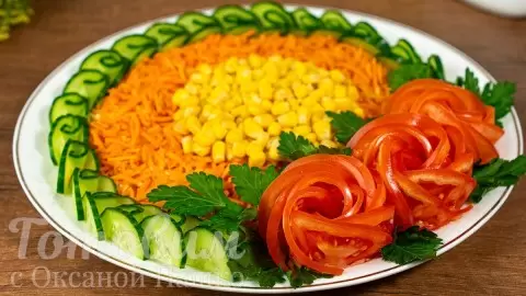 Праздничные застолья требуют не только вкусных блюд, но и зрелищной подачи. Новый салат с куриным филе, украшенный розами из помидоров, станет настоящей находкой для любого праздника. Нежное мясо сочетается с пикантной морковью по-корейски, а яркие цветочные элементы из овощей сделают его настоящим украшением стола.