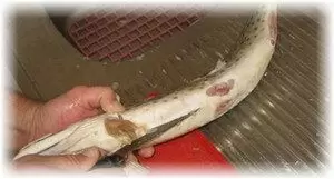 - Одной рукой удерживать хвост, другой - с помощью ножа или скребка осторожно поддевать чешую против её роста, сдвигая её на лезвии.