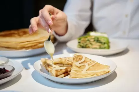 Для завершения угощения стоит заглянуть в кафе «Кстати», где подают креп-сюзетт — французский десерт из тонких блинов с клубничным соусом на коньяке и пломбиром. В кафе «Чудоград» блины подают с томлёным сельдереем и кремом из черной смородины, а также с киноа и морковью, взбитыми с медом и кедровыми орешками.