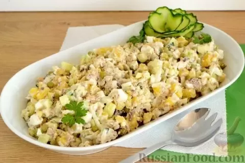 Также отличным выбором станет салат с картофелем, консервированными сардинами и зелёным горошком. Это блюдо не только быстро готовится, но и обладает насыщенным рыбным вкусом. Чтобы сделать его, отварите картофель и яйца, смешайте все ингредиенты и дайте настояться в холодильнике перед подачей.
