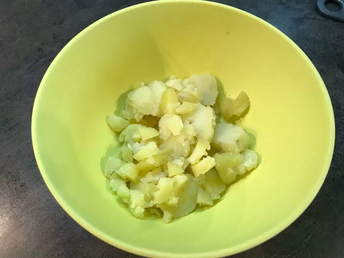- Очистить вареную картошку и нарезать её на небольшие кусочки.