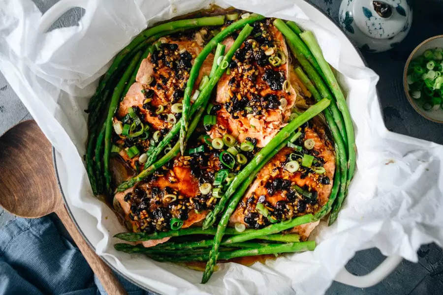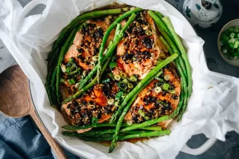 - На дно казанка или широкого сотейника уложите крупный лист кулинарной бумаги. На него выложите нарезанный репчатый лук, сверху разместите кусочки лосося (кожей вниз) и подключите спаржу. Полейте все это соусом.