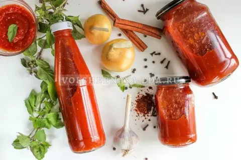 Сок кипятят, добавляют соль, сахар и давлённый чеснок, затем всыпают специи и уксус. Разводят крахмал в холодной воде и вносят тонкой струёй в кипящую массу, помешивая. Доводят до повторного кипения и снимают с огня. Разливают по банкам и закрывают крышками.