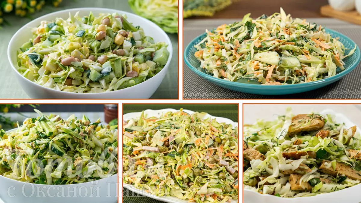- Салат с молодой капустой, морковью и огурцами: свежая капуста, натертая морковь и хрустящие огурцы в сочетании с зеленью и легкой заправкой из майонеза или горчицы.