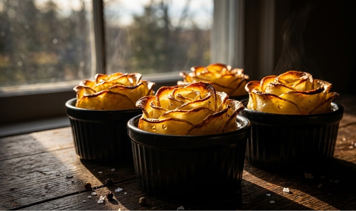 Возьмите формочки для кексов и положите на дно по ложке луковой начинки. Укладывайте картофельные слайсы по кругу, формируя бутон. Обязательно оставляйте пространство между лепестками, чтобы картошка хорошо пропеклась.