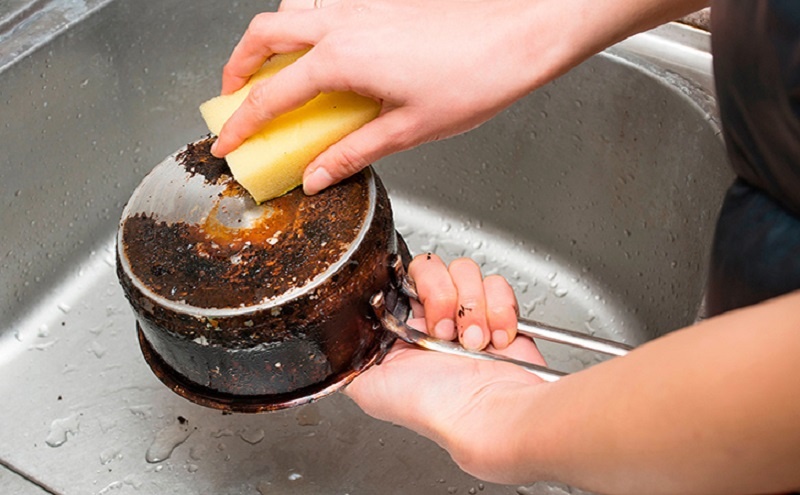 - Первый способ: Насыпать соль на пригоревшую поверхность и залить кипятком. Оставить на 10-15 минут — этого времени будет достаточно, чтобы остатки пищи начали отходить. После этого легко убрать загрязнения с помощью обычной губки.