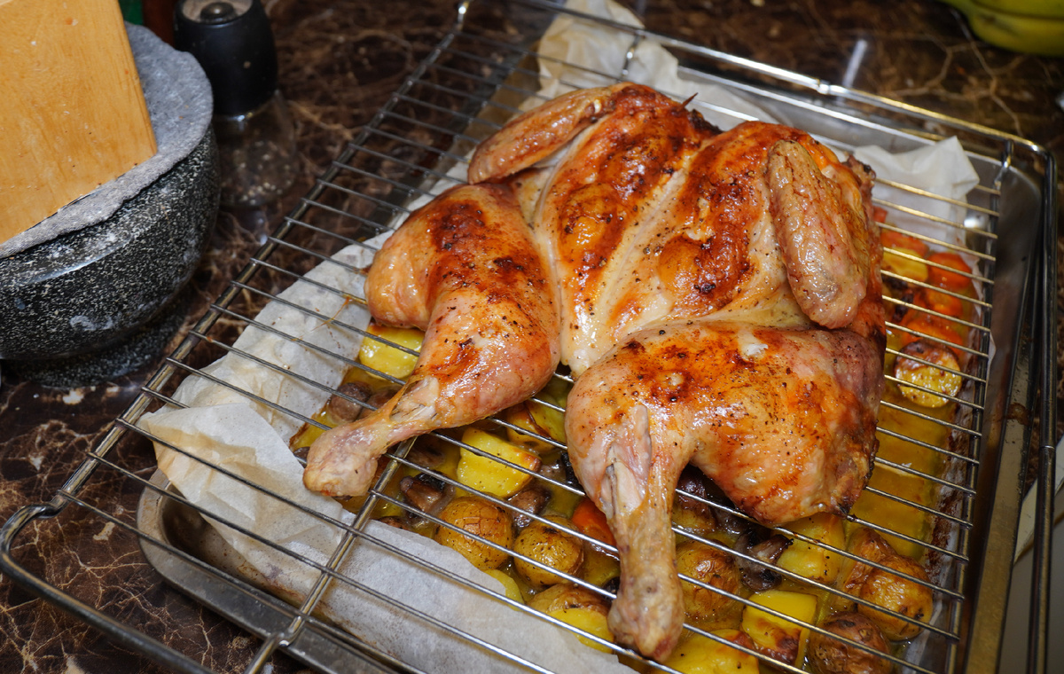 Далее следует поместить курицу на решетку в духовку, разогретую до 180 °C, в режиме конвекции. Курица будет находиться выше овощей, чтобы сок и масла стекают вниз. Запекание займет приблизительно 45 минут. Рекомендуется периодически поливать курицу соком из противня, чтобы она была еще более нежной и ароматной. В конечном итоге, общее время запекания составляет около 65 минут, пока корочка не приобретет золотистую хрустящую текстуру.