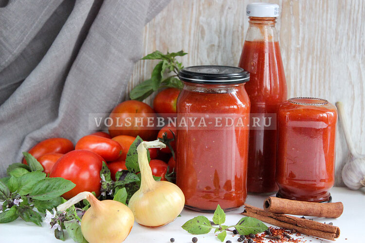 Сначала свежие помидоры тщательно промываются и обсушиваются. Крупные плоды стоит разрезать наполовину, чтобы облегчить процесс измельчения. Лук и чеснок очищаются от шелухи. Все подготовленные ингредиенты пропускаются через мясорубку с крупной решеткой, в результате чего получается большая кастрюля томатного пюре.