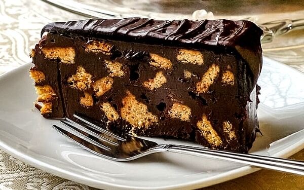 Этот насыщенный торт с выразительным вкусом темного шоколада обладает хрустящей текстурой благодаря ингредиенту, который можно назвать секретом королевского лакомства — печенью Rich tea cookies, пропитанному шоколадным кремом и покрытому нежной шоколадной глазурью.