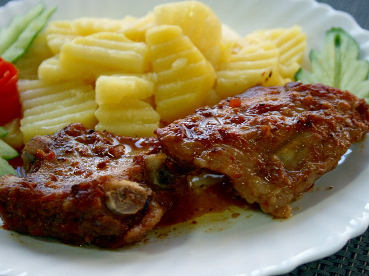Выбор ингредиентов подскажет результат: мясистые рёбрышки с лёгким слоем жира, молодой или средний картофель, который держит форму, и умеренная сладость меда, уравновешенная соевым соусом.